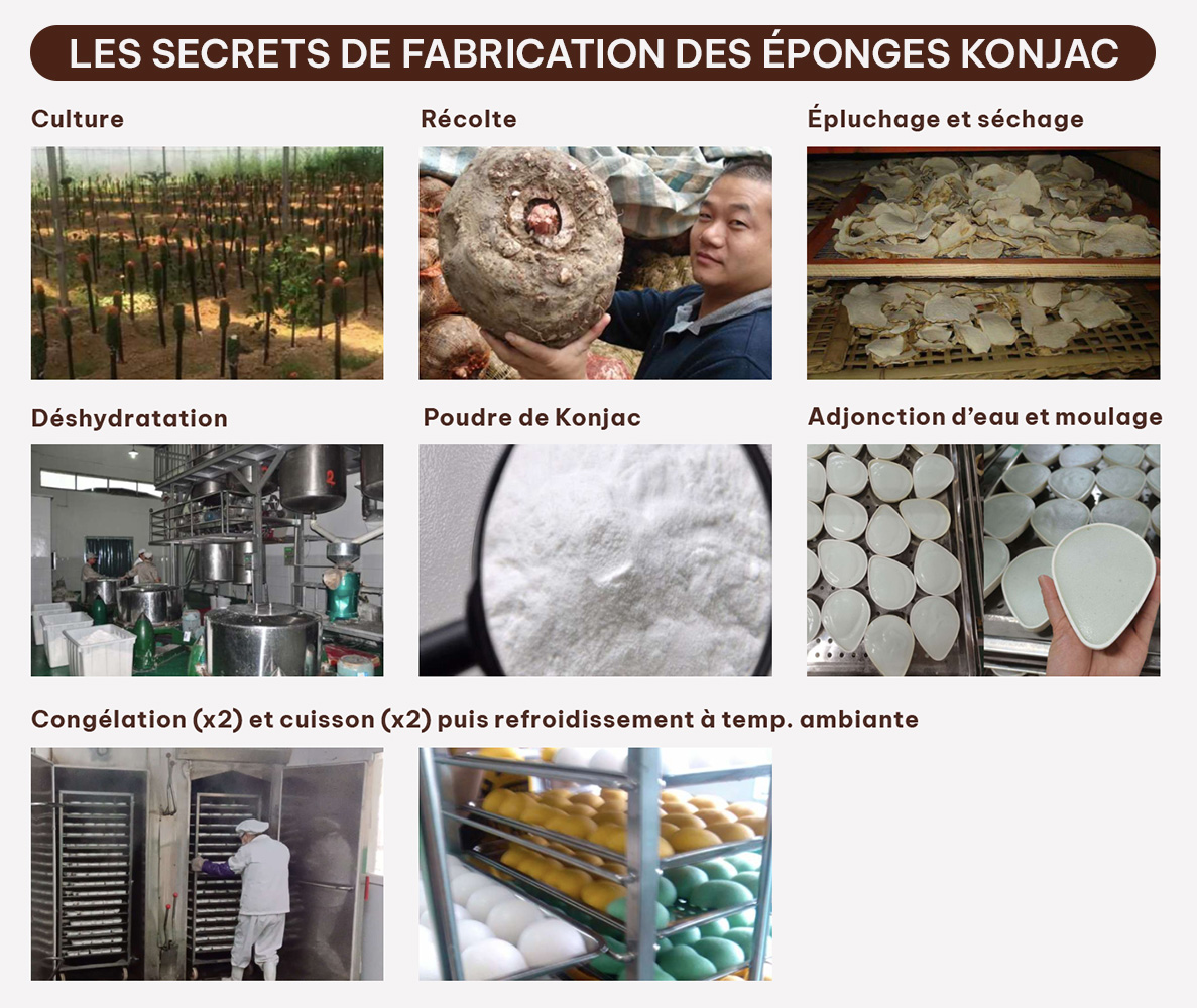 L'éponge Konjac est fabriquée à partir des racines de la plante éponyme, qui pousse principalement en Asie, en particulier au Japon, en Corée et en Chine. À l'époque, pour la fabrication des éponges, on utilisait la partie impropre à la consommation et on procédait de manière répétée à la congélation et au séchage à l’air libre pendant plusieurs jours. Le processus de fabrication actuel des éponges est le suivant : les racines de Konjac sont récoltées, épluchées et mises à sécher. Elles sont ensuite déshydratées afin d'être transformées en une poudre fine. Cette poudre est ensuite mélangée à de l'eau dans des moules afin de lui donner sa forme finale. Afin qu'elle acquière sa consistance particulière, elle devra être chauffée - cuite à la vapeur - puis refroidie. Le résultat de ce processus est une éponge douce et légère.